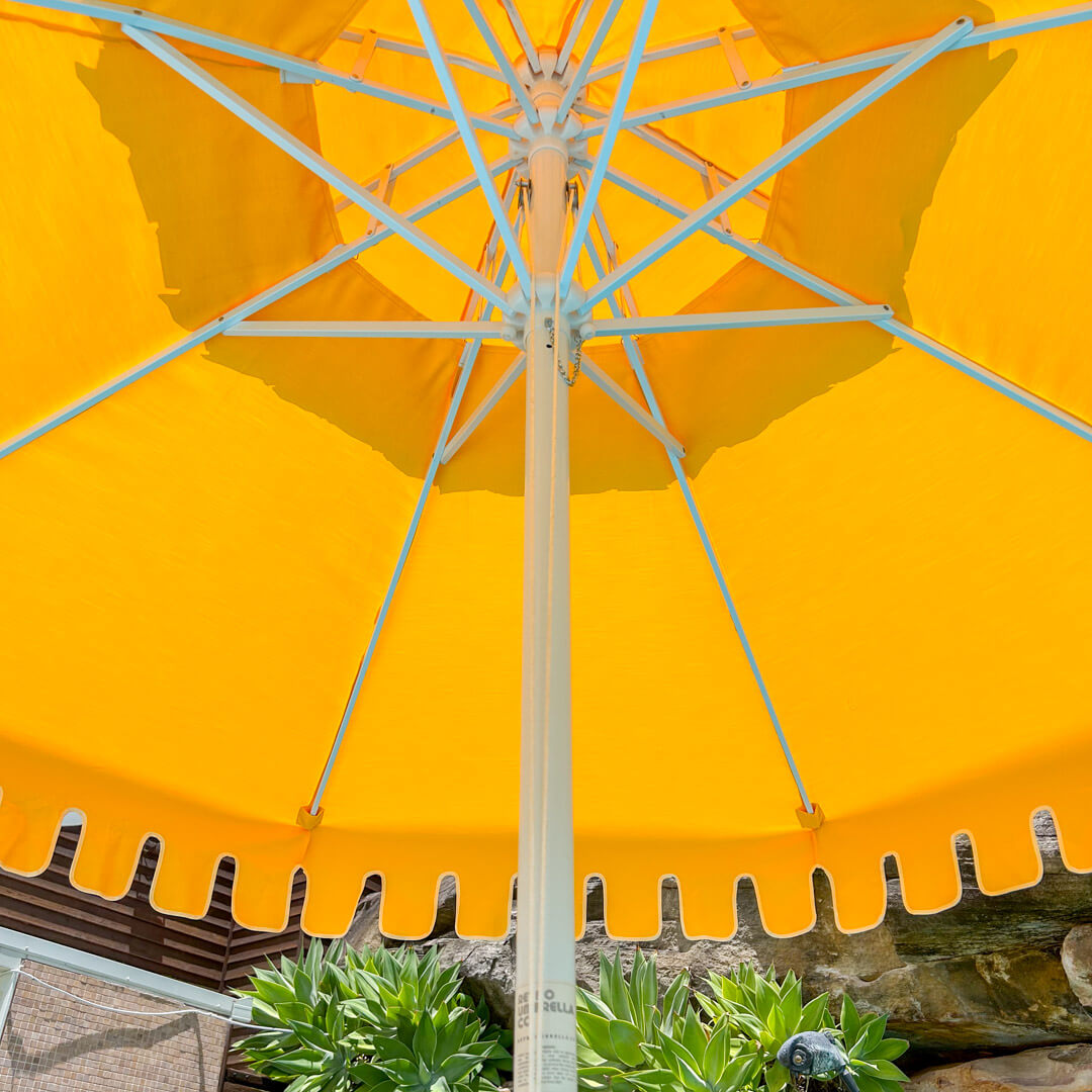Our umbrellas feature premium solution-dyed acrylic fabric, renowned for its exceptional durability. The unique process involves integrating the colour into the acrylic polymer before it's spun into yarn, ensuring the colour isn't just on the surface but runs deeply throughout the fabric. This advanced technique creates a material that's inherently resistant to fading and wear from harsh weather conditions, making it perfectly suited for the demanding Australian climate.